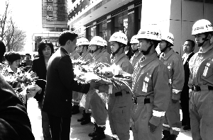 4月29日上午,扎西才吉在兰州三江源公司总部门前对兰州市消防支队广场中队14名刚从地震灾区玉树归来的战士举行了答谢仪式。