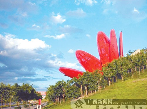 “盛开的朱槿”与五象广场的五象雕塑等一样,属于南宁市知名度较高的雕塑,据了解,它由澳大利亚DCM建筑事务所设计,于2002年正式落成。如果驾车从南宁市埌东高速收费站进入市区,可以看到道路的右边有一个800米长的斜坡,斜坡上散落10片由红色钢板制成的巨大花瓣,朝向不同、错落有致。在车速合适的情况下,可以看到10片花瓣竞相散开,宛如一朵朱槿花在盛开。