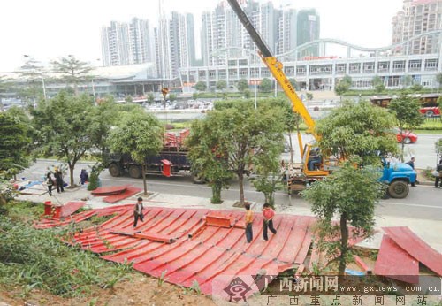 “朱槿花”雕塑被拆除的现场。记者 何定坚摄