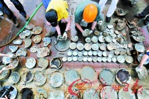 昨日清晨,汕头南澳岛“三点金”海域浪微风轻,《广州日报》等媒体记者顺利登上“南天顺”打捞船见证出水文物。据了解,仅昨天上午就出水了百余件文物,记者上船时,几名广东省文物考古研究所人员正在忙碌地用工具对这些文物进行冲洗清理。