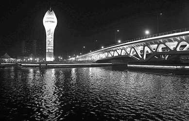 昨晚,徐汇滨江公共空间的主要灯景亮灯调试,宛若巨型毛笔的海事瞭望塔与“龙之脊”桥的LED七彩灯光交相辉映杨建正