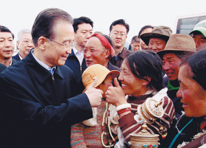 5月1日至2日,中共中央政治局常委、国务院总理温家宝再次赴青海玉树地震灾区,深入村庄、学校、“方舱”医院、自来水厂和寺庙等,看望慰问灾区各族干部群众,了解灾后群众安置情况,指导灾区恢复重建工作。这是5月1日,温家宝在前往隆宝镇的路上让司机临时停车,看望公路边临时安置点里的藏族群众。据新华社