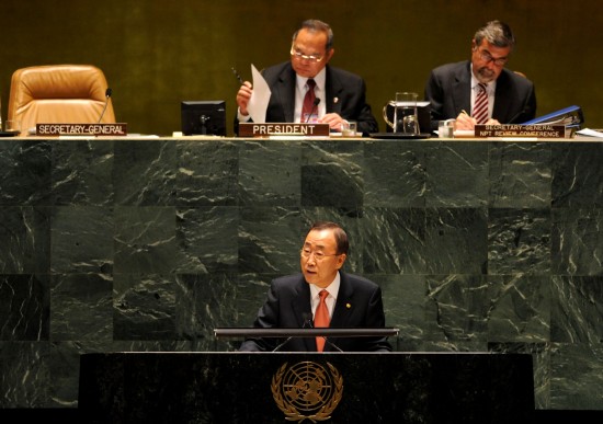 联合国秘书长潘基文在开幕式上致辞说,目前距首枚核弹在广岛爆炸已有65年,但世界仍然生活在核阴影之下。他说,《不扩散核武器条约》是历史上最为重要的多边条约之一,尽管并不完善,却是世界核不扩散体制的基石。该条约目前面临多重挑战,应对这些挑战需要国际社会平衡推进该条约所确定的核裁军、核不扩散及和平利用核能三大目标,不能有所偏废。
