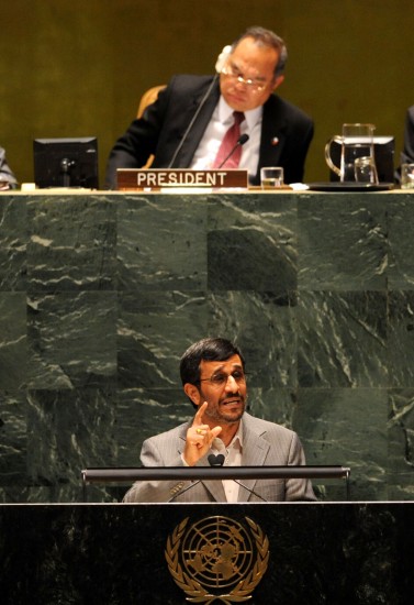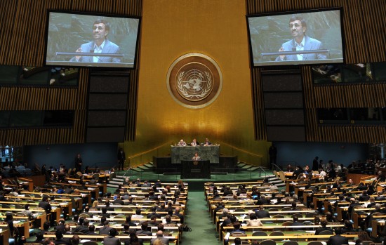 5月3日,在美国纽约联合国总部,伊朗总统艾哈迈迪-内贾德在《不扩散核武器条约》审议大会上发言。新华社记者申宏摄