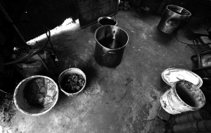 一座二层私宅背后的破烂简易棚内,污物、杂物遍地,苍蝇乱飞,飘荡着腥臭味,有两口大黑铁锅、几个黑乎乎的大桶,桶里装着突击检查前尚未出售的“猪油”。
