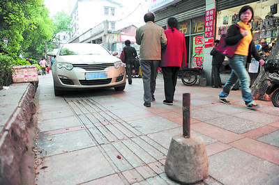 为方便盲人出行,长沙市改造后的街道均在人行道上设置了无障碍盲道。然而,连日来记者在长沙街头发现,仍有极少数车主随意占用盲道。尤其是在一些大宾馆、酒楼、饭店等消费场所门前,许多盲道却成了部分车主的停车场,汽车、电动车、自行车停在上面,让盲道形同虚设。