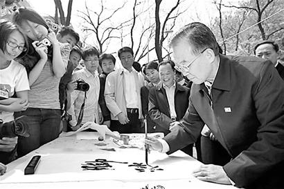 走到学生书画研究会的桌前,哲学系大二女生李丹琳铺开宣纸,蘸墨写下总理一首诗的题目“仰望星空”,赠送总理。温家宝沉思片刻,挥毫相和,写下“脚踏实地”四个大字。明媚的春光下,总理和学生互书的八个浓墨大字熠熠生辉,大家报以掌声。同学们知道,这八个字寄托着总理对广大青年学子的殷殷期盼之情。