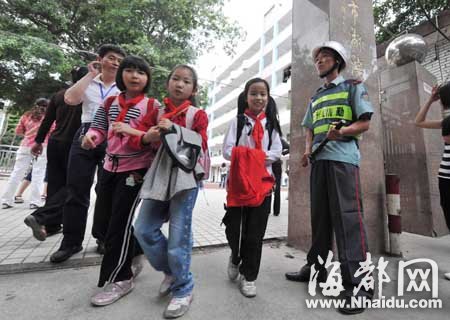 台海网5月5日讯 (海峡都市报记者 李建芳/文张超晖/图)警棍别在腰间,随身携带警用催泪喷射器(俗称辣椒水),昨天下午,福州市鼓楼实验小学两名校园保安的一身新行头,让在这里接送孩子的家长都多看了两眼。