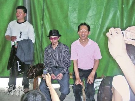 群众纷纷与犀利哥(左二)合照,但犀利哥却沉默寡言。