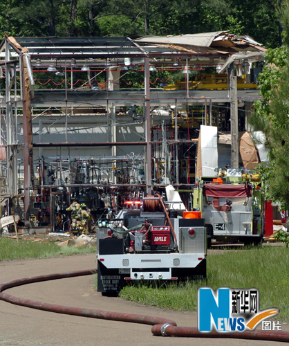 5月5日,消防人员在美国亚拉巴马州亨茨维尔市附近的美国陆军红石兵工厂爆炸现场救援。这所兵工厂航空导弹研发和工程中心10号试验区域当天上午发生爆炸,导致1人死亡,至少两人重伤。新华社/美联