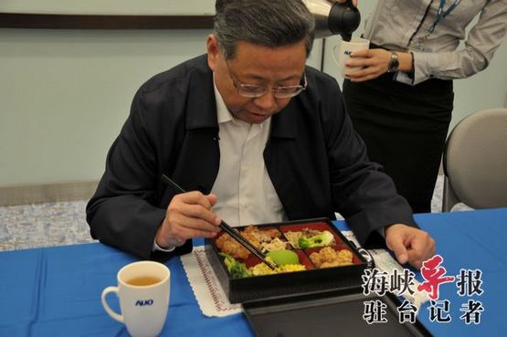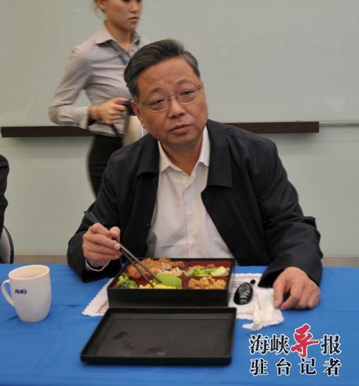 福建省长黄小晶昨天率领福建省经贸文化交流团访问台湾,今天上午访问了台湾友达集团,因访问交流行程紧张,中午就在友达集团会议室吃便当。