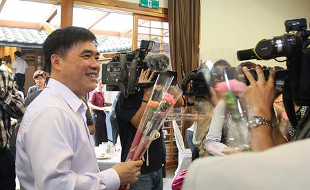 台海网5月9日讯 据台湾“中央社”报导,台北市长郝龙斌(前) 9日在市长官邸过母亲节,送花给现场的媒体记者,表达感谢,但记者们手拿摄影机,顿时不知该如何接受市长美意。