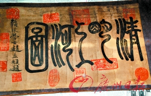 梁先生称,他是北宋大臣梁涛的第32世孙,这幅画辗转到了他的家族,一直保存至今。记者看到,这幅画右侧卷首有五个飘逸的篆体大字“清明上河图”,再右侧是“翰林学士赵孟頫题”的行书。画的上下左右还印着各种字体的红色印章。“‘清明上河图’这5个字是宋徽宗亲笔题写,上面还有个龙形的印章。‘翰林学士赵孟頫题’的上部,是个疑似‘双龙’的印章。”