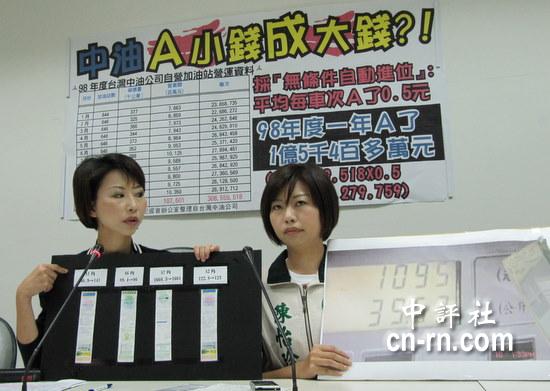 台海网5月11日讯 为了争取曝光,欲参选台南市议员的陈怡珍今天在姐姐、民进党“立委”陈亭妃陪同下召开记者会。陈亭妃表示,中油加油站计费方式,竟然把小数点尾数直接“无条件自动进位”,根据统计中油一年有3亿855万多车次加油,如果以每个人每次被A新台币0.5元计算,一年中油就会多赚1亿5千4百多万元。