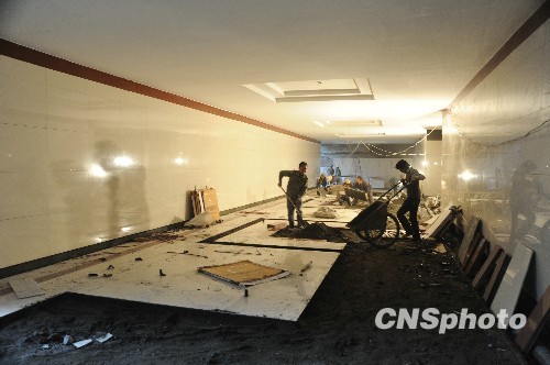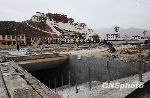 资料图:4月28日,布达拉宫广场地下人行通道已进入紧张施工收尾阶段。为确保工程按期完工,施工人员夜以继日,加班加点进行施工。 中新社发 冰明 摄