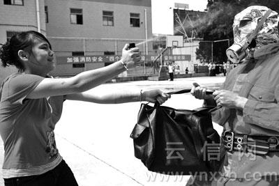 一名女生走在空旷的路上,背后冒出一名鬼鬼祟祟的男子。瞅着旁边没人,男子伸手抓住女生的包,企图抢夺。这时,女生突然掏出一个黑色瓶子,向盗贼脸上喷去。伴随着一声惨叫,盗贼立刻松开抓着提包的手,倒在地上,双手捂脸挣扎,痛苦万分。周围的掌声告诉大家,这是一场模拟防暴演习。