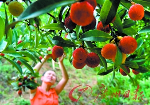 产于江浙一带的杨梅,在30多年前终于移植到了广东。在从化良口镇有万亩杨梅,是佛山、广州周边成片的最大的杨梅林,其中树龄最老的有10多米高。良口杨梅大多种在山头上,顺着山间小路婉转而上,杨梅就在山路边,伸手可及。爬上树,坐在树杈间,挑那些红得发黑发紫但依然硬扎的杨梅送进口里,体验乡村的乐趣、重温儿时的童真,体验最快乐的旅行。