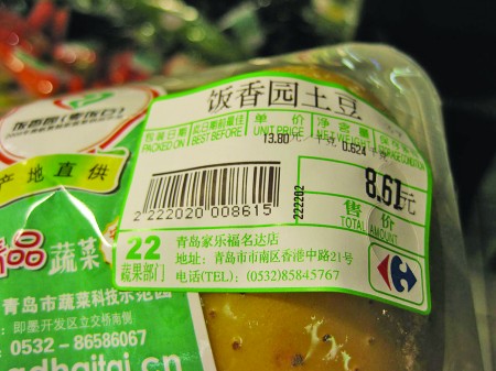 “5元一斤、4.8元一斤、7.9元一斤”记者走访青岛家乐福、大润发、利群等几家大超市发现,土豆只要用个塑料盘一装,包上保鲜膜,标明“产地直供”身价就比普通土豆涨了好几倍,同是产地直供同一品牌不同超市的土豆价格却不一样,每公斤最多能差4元多。记者在台东利群超市发现,一个货架上的散装土豆售价只卖2.58元一斤,而一个直供专柜上的土豆因身裹保鲜膜,标有产地和商标却卖5元一斤,而在市南区家乐福超市里,产地是北京的土豆被摆上大货架,只卖3.15元一斤,而标明产自即墨开发区的饭香园土豆因标有产地直供,却卖7.9元一斤,价格是北京产的两倍还多。