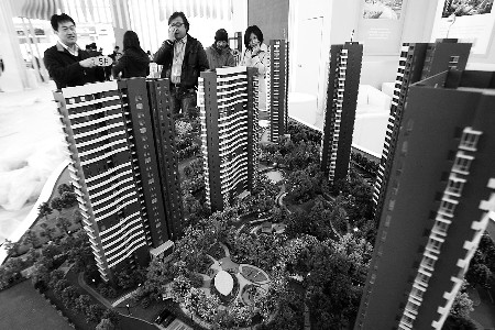 市民正在房展上看沙盘。