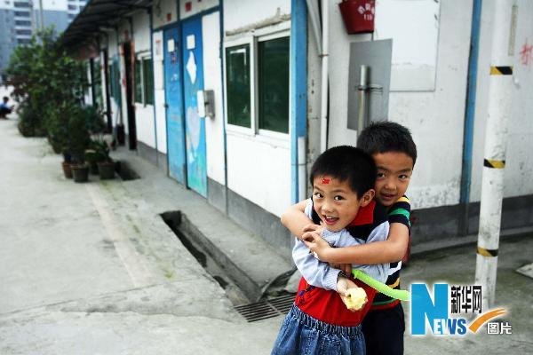 7岁男孩钟毅(前)和伙伴郎士贤在板房旁嬉闹(5月8日摄)。新华社记者郑悦摄