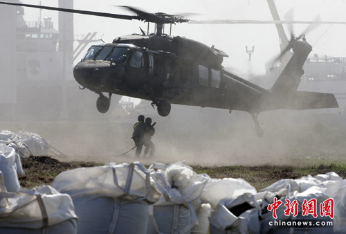 美军出动黑鹰直升机空投了一吨沙袋在海岸,以保护美国南部滨海区重要的湿地。
