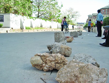 停 车 难已成 为 社 会问题 图为 一小区外路 边堵石阻止停车