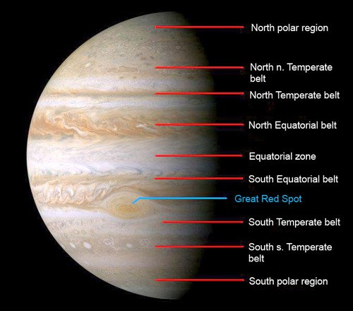 这些云团是由在不同高度形成的化学物质产生的。位于“区”里的海拔最高的白色云团,是由冻结的氨水组成的。颜色更深、海拔更低的云团是由硫磺和磷等化学物质构成的。木星快速旋转产生的时速高达350英里(563.27公里)的风,把这些云团吹成带状。著名的木星观测者安东尼·韦斯利,一直在澳大利亚他家的后花园观察木星正在消失的带状物。去年他在木星表面发现一个撞击斑。