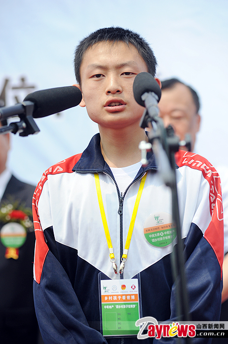 来自大同广灵县的侯进伟同学今年16岁,因母亲病逝,父亲又不幸遇到矿难丧生,使他不幸成为孤儿。可贵的是,在这样的情况下,小进伟自强不息,积极上进,在周围老师和同学的帮助鼓励下,英语考试成绩在全年级屡屡夺冠。小进伟作为此次赴世博的学生代表在活动现场发言。小进伟告诉记者:“能代表这次去上海世博会的小伙伴们发言,我感到非常的荣幸。为了这次发言,我精心准备了发言稿,并且是中英文对照的。希望这次去世博会,不仅是看世博,更要力所能及地在世博会上宣传家乡山西。”