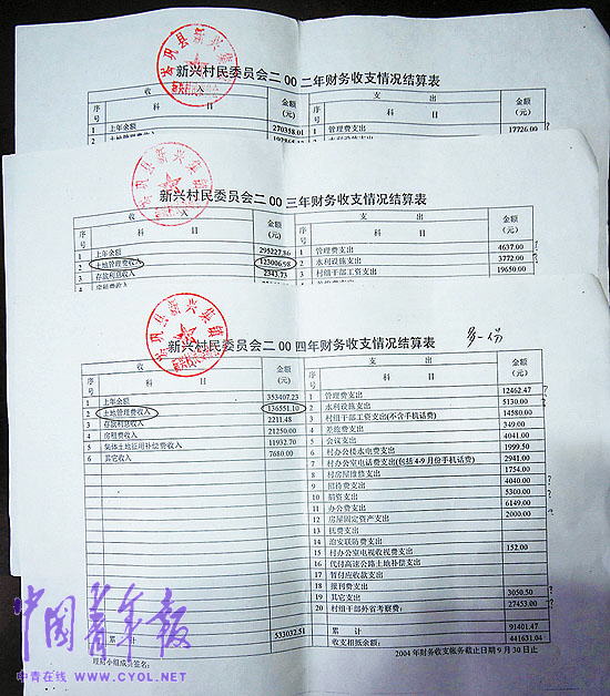 新兴村村委会财务收支结算公开表原件(2002~2004年),标记处为岑巩县国土局向新兴村村委会支付的“管理费”,这项费用是村委会“推进”协调征地的工作经费。本报记者 丁先明摄