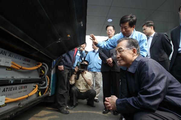 5月13日至14日,中共中央政治局常委、国务院总理温家宝在天津调研。这是5月14日,温家宝来到天津力神电池股份有限公司,详细了解锂离子蓄电池的研制、生产情况。 新华社记者 刘卫兵 摄