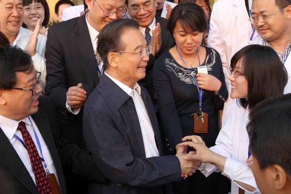 5月13日至14日,中共中央政治局常委、国务院总理温家宝在天津调研。这是5月13日,温家宝在天津市国际生物医药联合研究院考察时与员工亲切交谈。 新华社记者 刘卫兵 摄