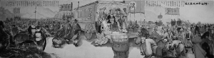 原山丹县文化局党总支书记周春林曾对“万国博览会”进行过深入研究。“隋炀帝是历史上来张掖的帝王中最排场、最显赫的一位。”周春林这样说是有一定依据的。他告诉记者,隋炀帝当时西巡的随军“行宫”由“六合城”、“六合殿”、“千人帐”三部分组成。“六合城”用作寝宫,方一百二十步、高4丈2尺(相当于现在长100米、宽32米、高6层的两幢楼房),可容纳侍卫600人,而且车载轮运,装卸方便;“六合殿”用作“观风行殿”(观风问俗,接见宾客),装饰有车帘幕布,设置击警暗器,装车铃马轮,分合两用十分方便,可容纳侍臣及三卫仗数百人;“千人帐”可容纳千人,用来议事庆典、大宴群臣。隋炀帝西巡张掖的第七日,乘坐龙凤辇东行到焉支山下。“万国博览会”会场气势恢宏,欢声雷动,西域诸国商贾云集。西域27国的王公使臣,佩金玉,饰锦绣,早在道旁拜谒迎接隋炀帝。