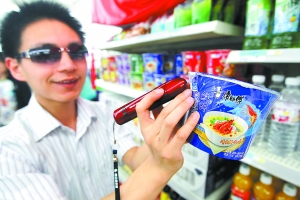 王晋川靠近盲人购物专区上的货架,左手试探性地摸着矿泉水瓶上带有凹凸点的盲符标签,右手拿着深红色的识别笔向标签靠近,大约隔着5毫米的距离,识别笔开口报出“康师傅矿泉水,保质期12个月,生产日期2010年5月11日,净含量596毫升”。听到声音后,王晋川满意地将矿泉水拿在手里。