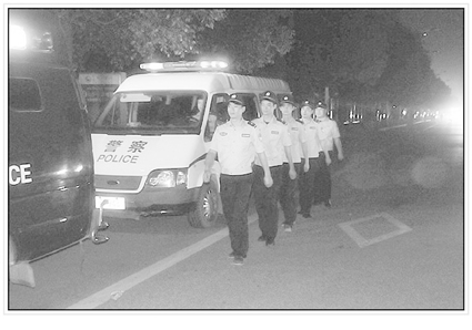 100辆警车停放在市城区主干道的30个站点、20个主要交通路口,所有的警灯全部打开———几乎每隔50米,过往市民就能见到一辆警灯闪烁的警车,以及警容威严的警察在街道巡逻。