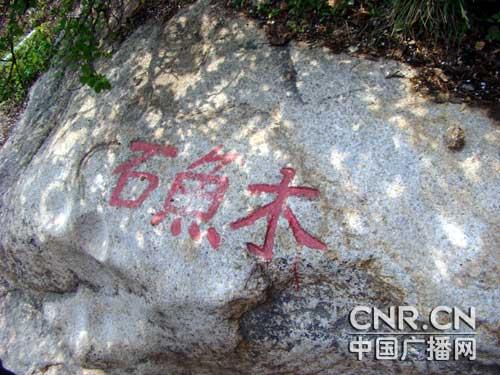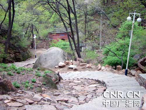 环保旅游车,首先将车友们送到了“古刹龙泉”的牌楼前。大家下车后穿过雕梁画栋的牌楼,顺缓缓上行的山坡前行。拐过两个弯后,只见前方不远开始出现通向龙泉寺蜿蜒曲折的石板山道。进入山道不远,只见路旁的一块巨石上刻有“锺灵毓秀”四个苍劲挺拔的大字。仔细一看,原来这是薄一波同志于1983年8月所题。据导游说:这四个字体现了“千山结合天地之灵气,孕育山川之秀美”的含义。