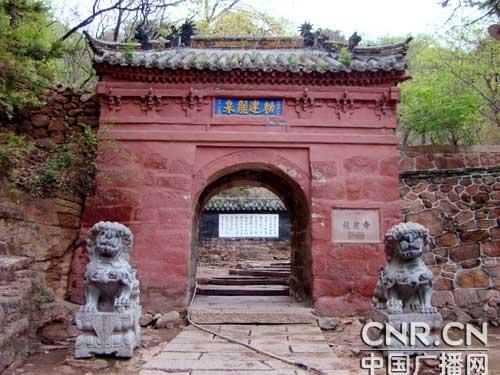 进入古刹山门后,继续沿蜿蜒曲折的山道向上,很快来到了龙泉古刹的第二道山门。经过“龙泉古刹”的门洞,也就走进了电影《古刹钟声》的外景拍摄地。当年拍摄电影《古刹钟声》时小和尚打水的位置就是两口小红井,一口井水甘甜可口是庙上饮用水,另一口又苦又涩不能喝,左边井就是庙上饮用水,另一井边浇花浇菜都不用它,其实水质的不同,也是出手打井人的忌讳之处,因为近在咫尺不在一水脉之上,所以也象征人生有苦必有甜,有甜必有苦的说法。