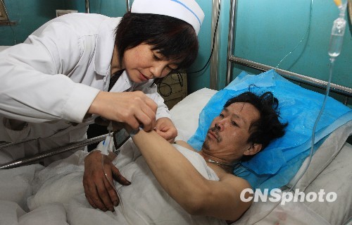 来自云南的获救矿工李中毅在盂县人民医院接受治疗。中新社发