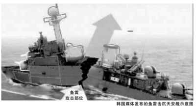 韩国媒体发布的鱼雷击沉“天安”舰示意图据韩国联合通讯社和YTN电视台报道,韩国外交通商部长官柳明桓19日在首尔说,已查明导致“天安”号警戒舰沉没事件的原因是鱼雷爆炸,“确信”是被朝鲜击沉。他说,韩国政府将根据调查结果,以“坚决而审慎的方式采取适当举措”。