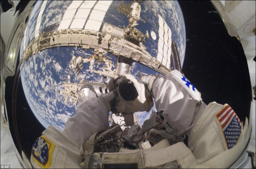 宇航员拍到头盔上映射出的地球和国际空间站(组图)
