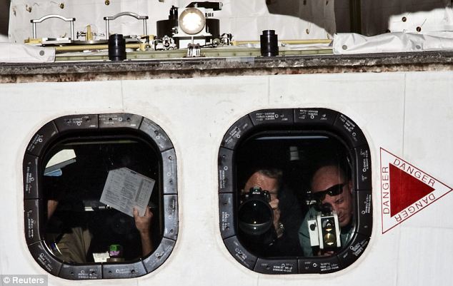 完成和国际空间站对接的“亚特兰蒂斯”号宇宙飞船。目前国际空间站中有12名宇航员。国际在线专稿:据《每日邮报》5月19日报道,跟随亚特兰蒂斯号宇宙飞船前往国际空间站的宇航员加莱特·莱斯曼在执行太空行走任务时,拍到了头盔中映射出来的蓝色地球以及空间站。