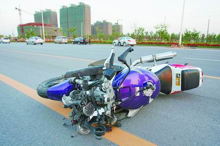 记者看到,事发现场位于郑开大道拐向岗李村的一个小土路路口西侧。一辆标有“MEA068-雨中漫步”字样的白色“本田趴赛”摩托车歪倒在路中央的黄线上,车双前叉均向后扭曲,前刹车盘也已破裂,车身多处扭曲变形。而横在该车西侧数十米远的电动车更是支离破碎,一地残片。在摩托车划痕中段部位,有一个带血的红色摩托车头盔。