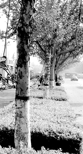 “那是石灰,每年春、秋两季绿化部门都会给树刷,各个绿化部门都负责自己辖区的。”金水区绿化管理所工作人员李女士说,刷石灰有两个作用,一是杀菌。