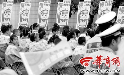 昨日上午9时30分,交警雁塔大队在西安市兴华小学举行交通警察进校园启动仪式,首批向雁塔区的24所中小学派驻24名交警,通过一对一的方式,确保校园周边道路交通的安全。同时,还考虑孩子的喜好,为每所学校门口设计制作了两块被孩子们称为“黑猫警长”的、卡通警察交通安全宣传牌。