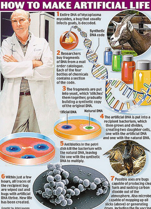 美国J·克雷格·文特尔研究所的研究人员在最新一期美国《科学》杂志上报告说,他们人工合成了一种名为蕈状支原体的细菌的脱氧核糖核酸(DNA),并将其植入另一个内部被掏空的、名为山羊支原体的细菌体内。15年间花费4000万美元、经过多次失败的尝试后,最终他们使植入人造DNA的细菌重新获得生命,并开始在实验室的培养皿中繁殖。