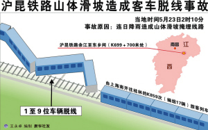 23日2时10分,因连日降雨造成山体滑坡掩埋线路,由上海南开往桂林的K859次旅客列车,运行至江西省境内沪昆铁路余江至东乡间,发生脱线事故。事故已造成19人死亡,另有71人受伤接受治疗。