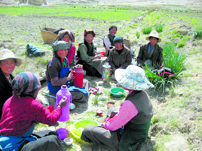 藏族农妇正在青稞地里吃中餐。虽然简单,但她们很享受。