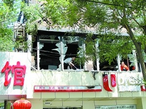 紧接着,8辆消防车先后赶到现场。赶到现场后,消防队员从正面敲开了这家饭店二层的一排窗户上的玻璃,以便灭火,大量黑烟也随之飘了出来。另外,还有消防队员从楼后面爬到楼顶上,用水枪灭火。餐厅二楼上一块很大的招牌,写着餐厅的名字,外面涂着黑漆,颇为精美。但大火过后,变成了灰色,餐厅的名字也烧得看不清楚。
