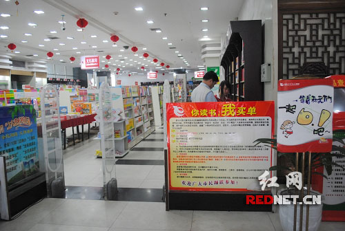 (株洲市新华书店门口立起醒目的“你读书,我买单”宣传牌。吴雯芳 摄)