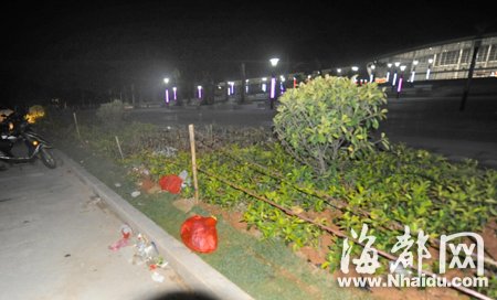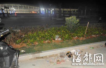 站前广场的垃圾(在采访车车灯照射下拍摄)