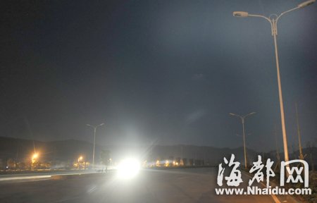晚9时55分,采访车终于开上进入通往火车站方向的路。在这段3公里长的双向六车道的大路上,路灯已经装上,但却一盏未亮。在火车站附近卖杂货的女老板说,火车站启用后,她就在这里卖东西,但这里的路灯从安装好到现在,从来没有亮过,走这条路都怕怕的。
